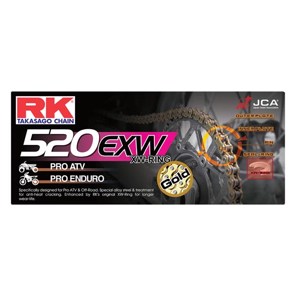 One of RK Chains most popular ATV rated chain is the 520EXW. EXW is an XW-sealed chain and is the best high-speed, extreme heat performance off-road and ATV chain available today. RKs XW-Ring seals utilize triple barrier grease protection plus anti-debris technology. EXW was designed to handle ATV swingarm movement and increased torque stresses and wears 1.7 times longer when compared to O-ring chains. EXW chains also feature special thermal crack resistant sideplates to protect against thermal cracking. Thermal cracking can result from debris or components impinging the chains movement. The impingement causes the chain to quickly heat up and cool down in rapid succession. Over a period of time this thermal exposure can reduce the strength of the chain and/or cause a chain failure. It is vitally important to check your bike after a crash to make sure no debris or bike components are in contact with the chain.