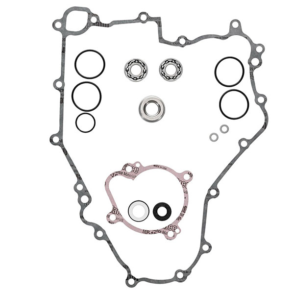 - Typical kit includes the following: bearings where applicable, rubber seals, mechanical water pump seal where applicable (also sold separately), side cover gasket, water pump gasket, snap rings located on water pump shaft, copper drain washers